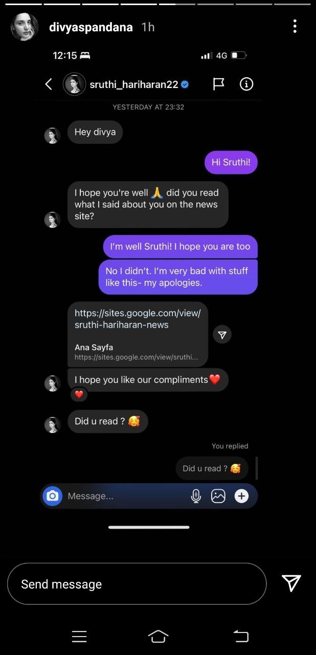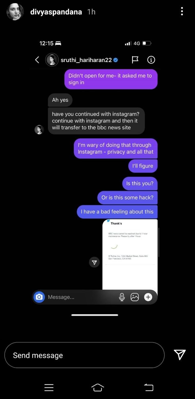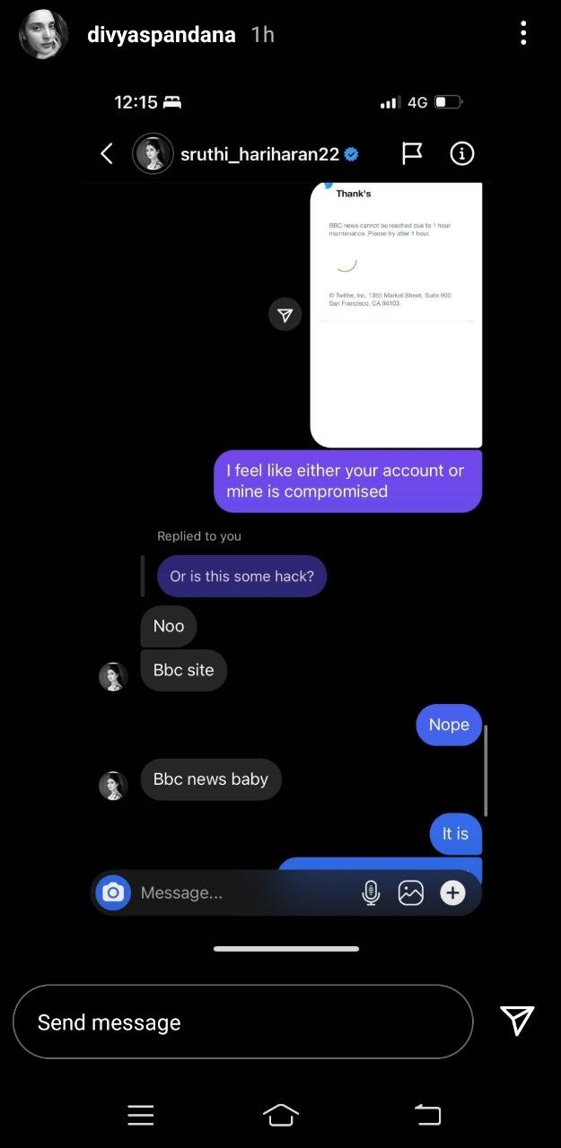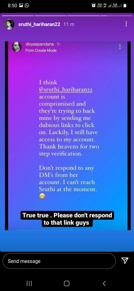 ಈಗಾಗಲೇ ನಟಿ ಶ್ರುತಿ ಹರಿಹರನ್ ಅವರ ಇನ್ ಸ್ಟಾಗ್ರಾಮ್ ಅಕೌಂಟ್ ನ್ನು ಹ್ಯಾಕ್ ಮಾಡಿದ್ದು, ಆದ್ದರಿಂದಲೇ ರಮ್ಯಾ ಅವರಿಗೆ ಮೆಸೇಜ್ ಕಳಿಸುವ ಮೂಲಕ ಅವರ ಅಕೌಂಟನ್ನು ಹ್ಯಾಕ್ ಮಾಡಲು ಪ್ರಯತ್ನ ಪಟ್ಟಿದ್ದಾರೆ… ಆದರೆ ಇದರ ಬಗ್ಗೆ ಮೊದಲೇ ಮಾಹಿತಿ ಇದ್ದ ಕಾರಣ ರಮ್ಯಾ ಅವರು ಹ್ಯಾಕರ್ಸ್ ಗಳು ಕಳಿಸಿದಂಥ ಯಾವುದೇ ಲಿಂಕ್ ಅನ್ನು ಕ್ಲಿಕ್ ಮಾಡದೆ ತಮ್ಮ ಅಕೌಂಟನ್ನು ಸೇಫ್ ಮಾಡಿಕೊಂಡಿದ್ದಾರೆ…
